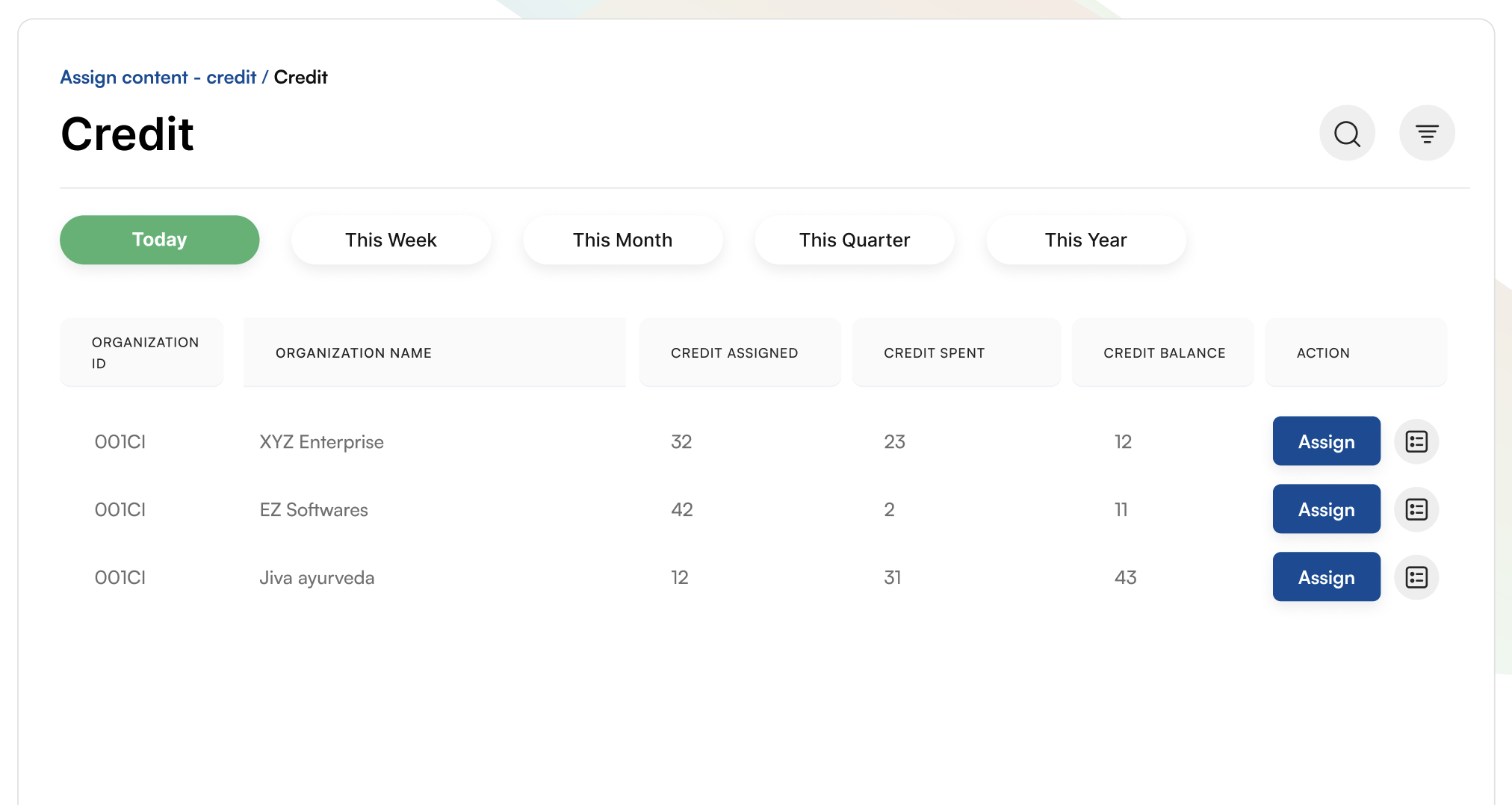 Streamlined interface to manage content and credit assignments across client organizations. View assigned vs unassigned metrics and quickly add new assignments with separate modules for content and credit management.