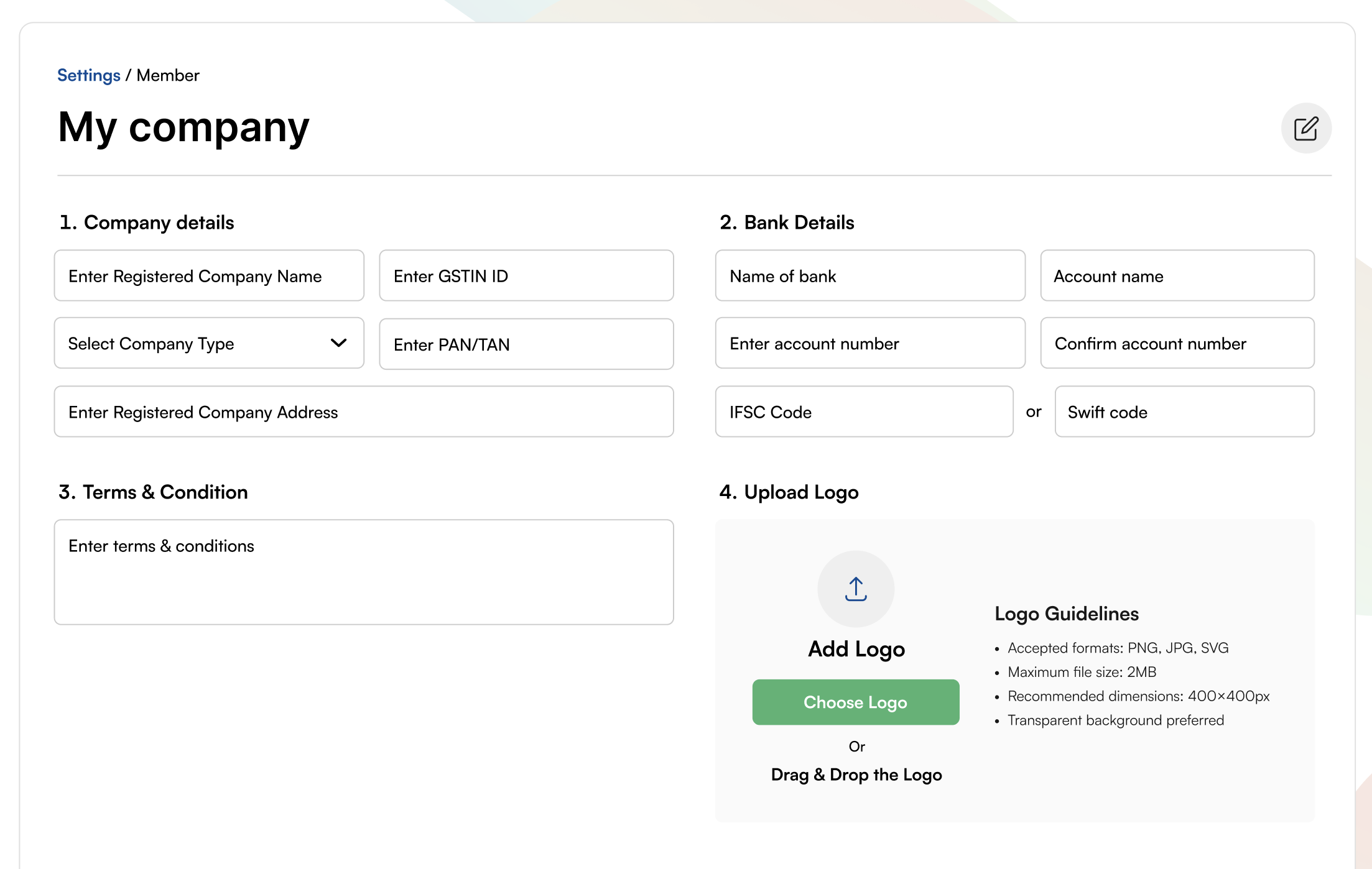 Maintain comprehensive company details including registration information, tax IDs, banking details, terms & conditions, and custom branding with logo uploads for professional invoicing and quotations.