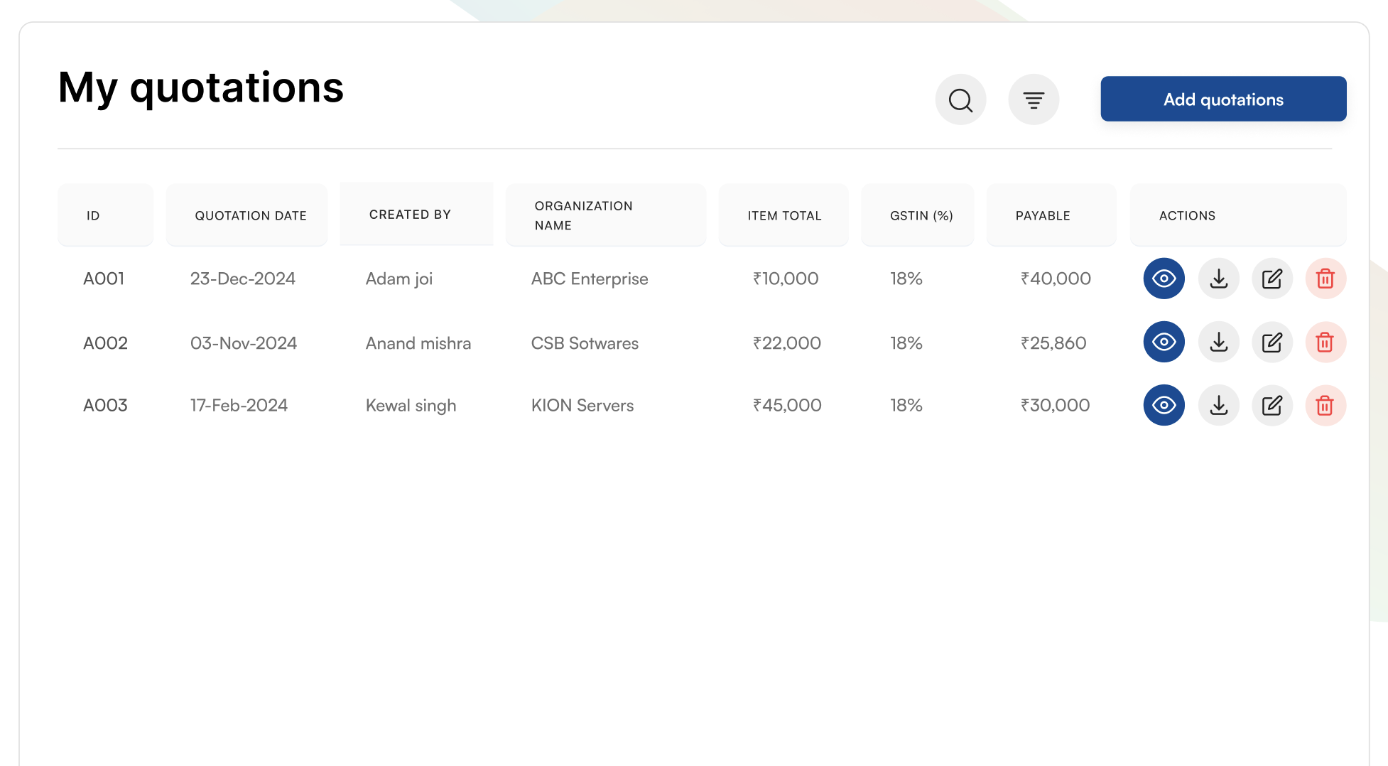 Create, manage, and send professional quotations to clients with comprehensive tracking of quotation status, pricing details, GST calculations, and multi-action capabilities including view, download, edit, and delete.